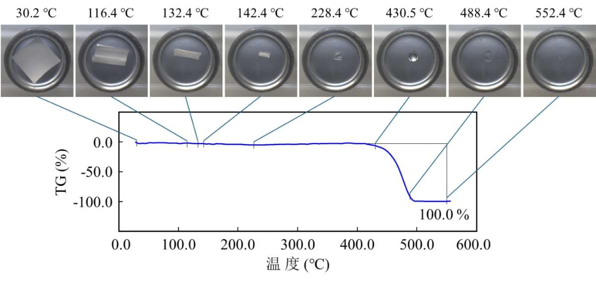使用STA对纯聚乙烯隔膜的热稳定性进行测试,结果显示在450°C时发生了一次热分解。由于样品质量较小(0.056 mg),观察到轻微的基线波动。Real View®图像证实,在测量过程中,这些波动是由于材料在样品盘中移动和形状改变而造成的。